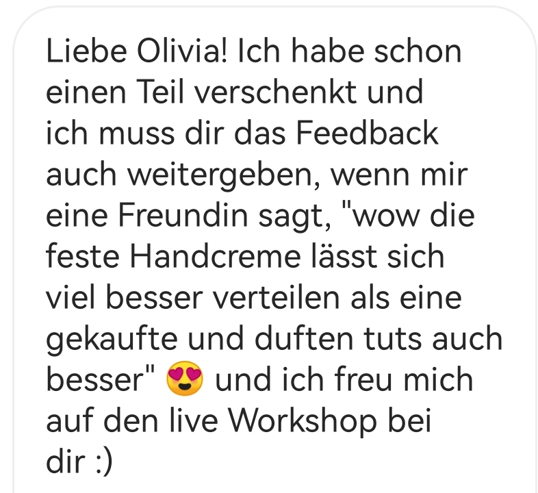 Meine Shampoo – oder Duschbars, die Gesichtscreme oder verschiedene Öle und Deos möchte ich nicht mehr hergeben. Vielen Dank für die unglaublich viele Arbeit, die in diesen Kursen steckt und für uns so toll verständlich vermittelt werden. Man spürt, dass du mit ganzem Herzblut dabei bist!