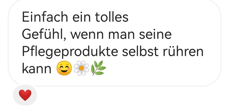 Ich liebe die Gesichtsöle, und Gesichtswasser, so einfach herzustellen und genial in der Anwendung. Ich brauche nichts anderes mehr. Und meine Geschenke werden seit deinem Kurs nur mehr selbst gerührt. Lippenpflegestifte, feste Handcreme-Bar, Badebomben, Körperöle,… und meine Familie und Freunde lieben es und wollen mehr. Ich könnte so viel aufzählen, was ich schon alles gemacht habe. Ich liebe es einfach selbst zu rühren. Danke, Danke und mache bitte weiter so.